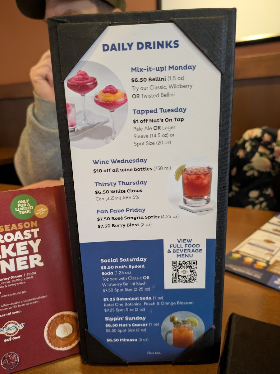 For breakfast lovers, Nat's Hearty Breakfast options are a must-try, featuring eggs any style with a choice of bacon or sausage, perfectly paired with your favorite potatoes. The drink selection doesn't disappoint either, with options like a refreshing Sauvignon Blanc and a rich Cabernet Sauvignon to elevate your dining experience.